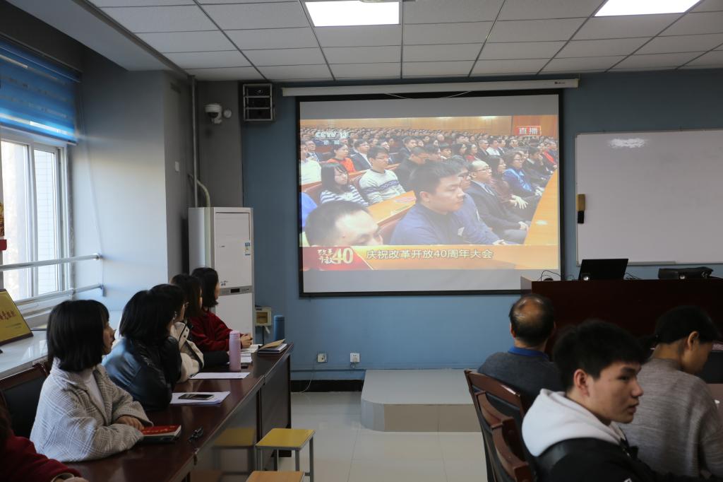 2018年12月18日上午10时,商务旅游系党总支在4A310教室认真组织全体教工党员和学生党员、发展对象和入党积极分子认真收听收看了庆祝改革开放40周年大会直播,共同感受祖国强劲的脉搏,共同畅想祖国更加美好的明天。