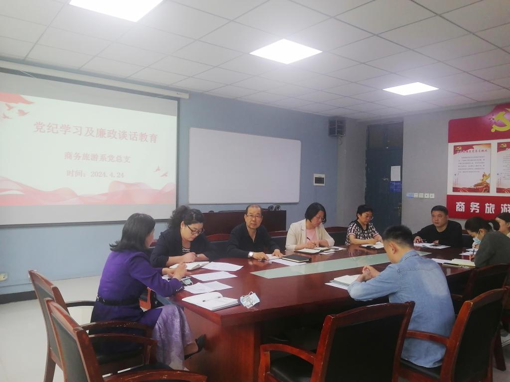 4月24日下午,商务旅游系党总支在党员之家召开党纪学习及廉政谈话教育会议。会议由系党总支书记陈振锋主持,系副科级以上干部参加会议。