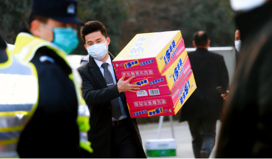 (图为姬效才在新冠疫情期间为贾峪镇党政干部与执勤民警援助物资)