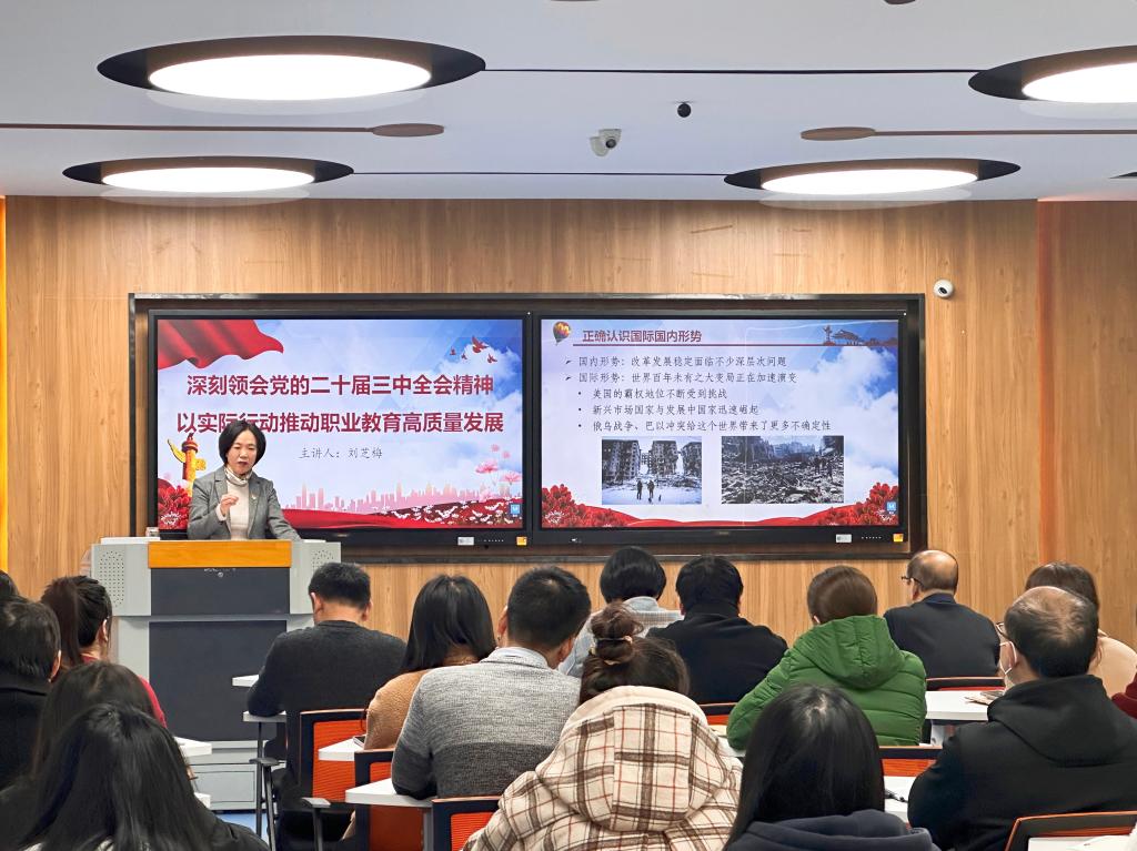 刘芝梅以《深刻领会党的二十届三中全会精神 以实际行动推动职业教育高质量发展》为题,结合时政热点,围绕正确认识国际国内形势、准确把握进一步全面深化改革坚守的原则、聚焦职业教育高质量发展三个方面进行了深入浅出地讲解,为在座师生剖析了“六个坚持”重大原则的精髓与要义,对商务旅游系突破发展短板、进一步做好教育教学改革和学生思想政治教育工作提出新的要求。