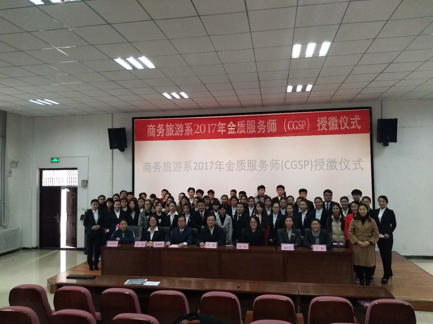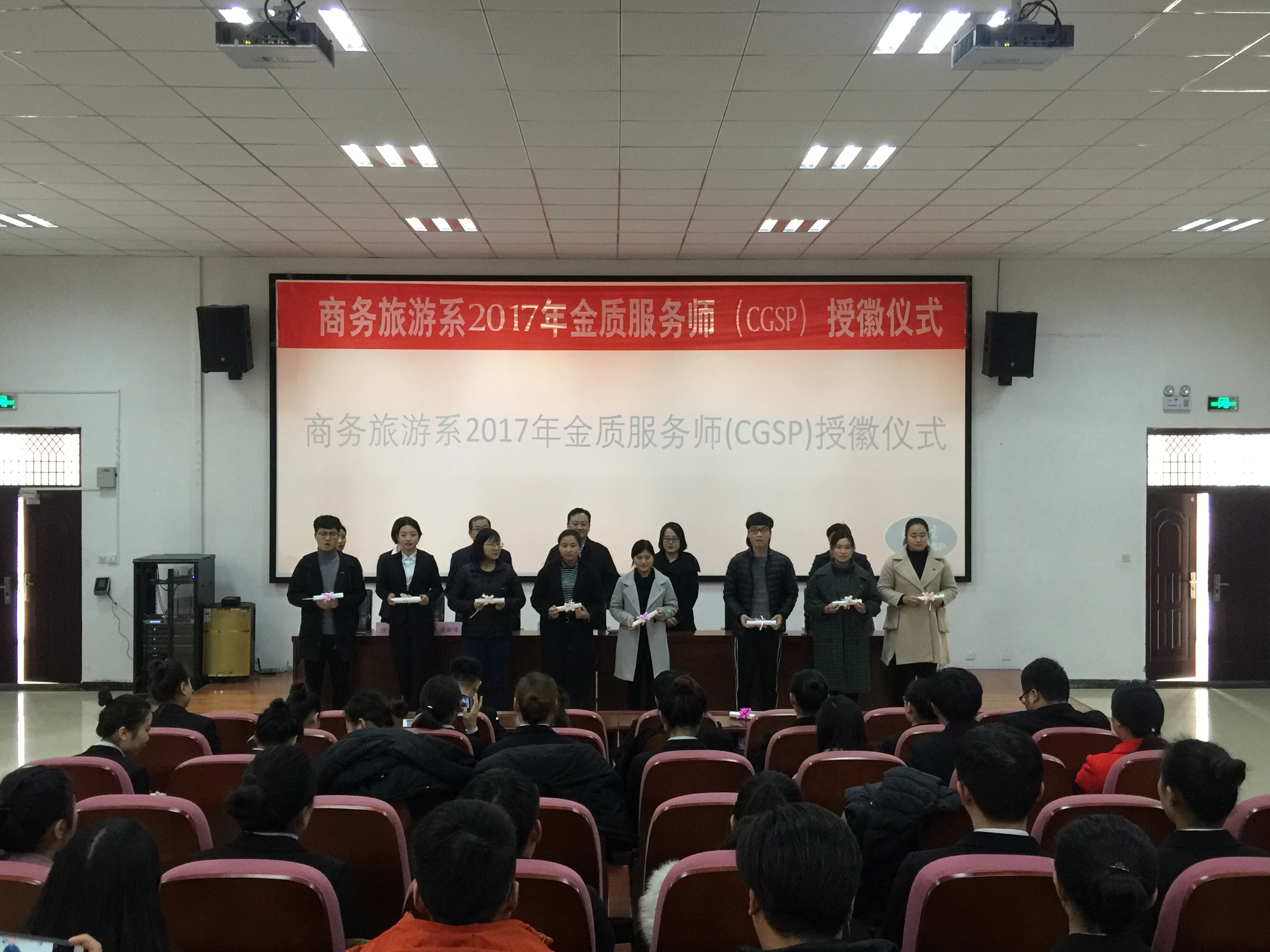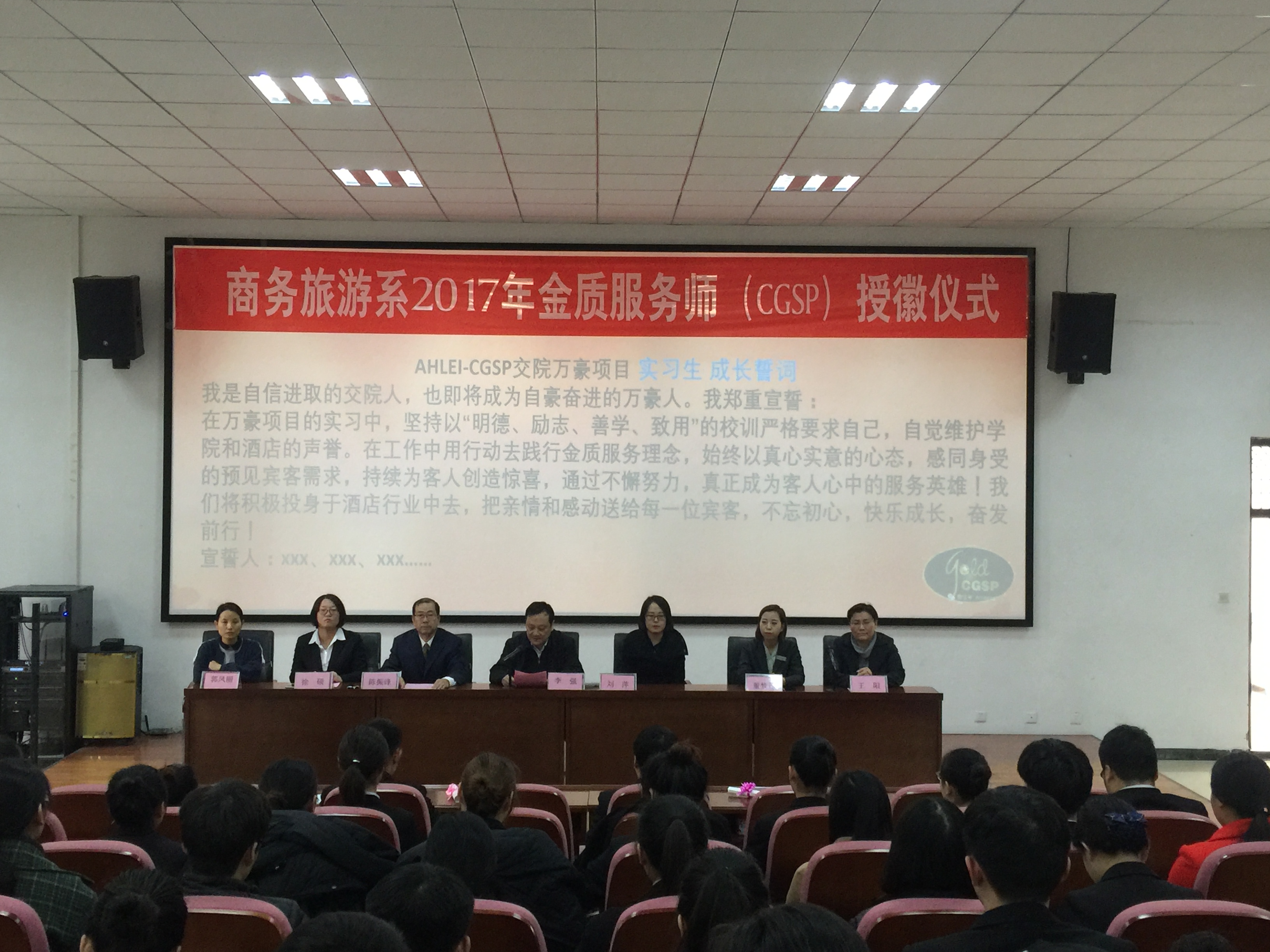12月28日下午3点,商务旅游系在物流学院报告厅举办酒店管理专业CGSP(金质服务师)授徽仪式。参加此次仪式的嘉宾有:郑州汇艺万怡酒店校企关系经理董梦丹、人力资源部总监刘萍、美国饭店协会教育学院河南代表处负责人王阳、河南交通职业技术学院院长李强、商务旅游系主任陈振锋、副主任郭凤丽、徐硕等。授徽对象为商务旅游系通过CGSP认证的5名教师以及64位学生。