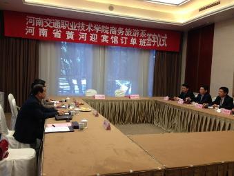 2014年3月31日下午三点整,筹划许久的交通职业技术学院商务旅游系与黄河迎宾馆订单班签约仪式在国宾馆第三会议厅顺利开展。与会人员有国宾馆人力资源部经理、客房部经理、宴会部经理等以及我院领导及商务旅游系系主任与专业课老师。