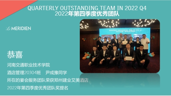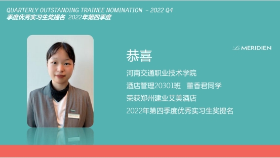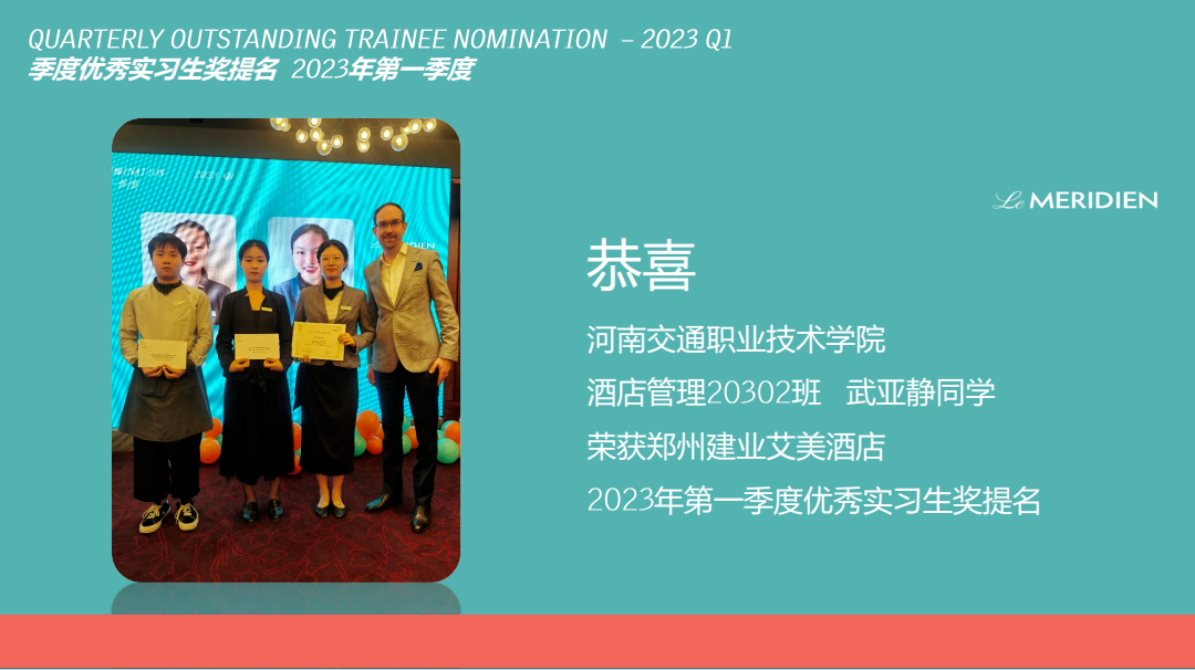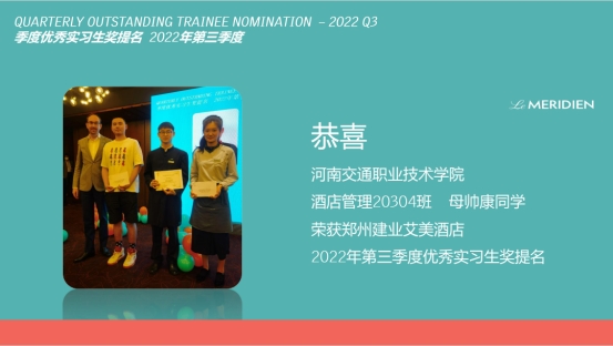 近日,我系优质校企合作企业郑州建业艾美酒店对实习工作中表现突出的学生进行表彰,以激励同学们更加努力地主动融入到企业的文化氛围当中,不断提高自身的专业技能水平和人文素养的本领。其中我系母帅康、董香君、武亚静、牛笑颖、尹成豫5名同学荣获郑州建业艾美酒店季度“优秀实习生”荣誉。